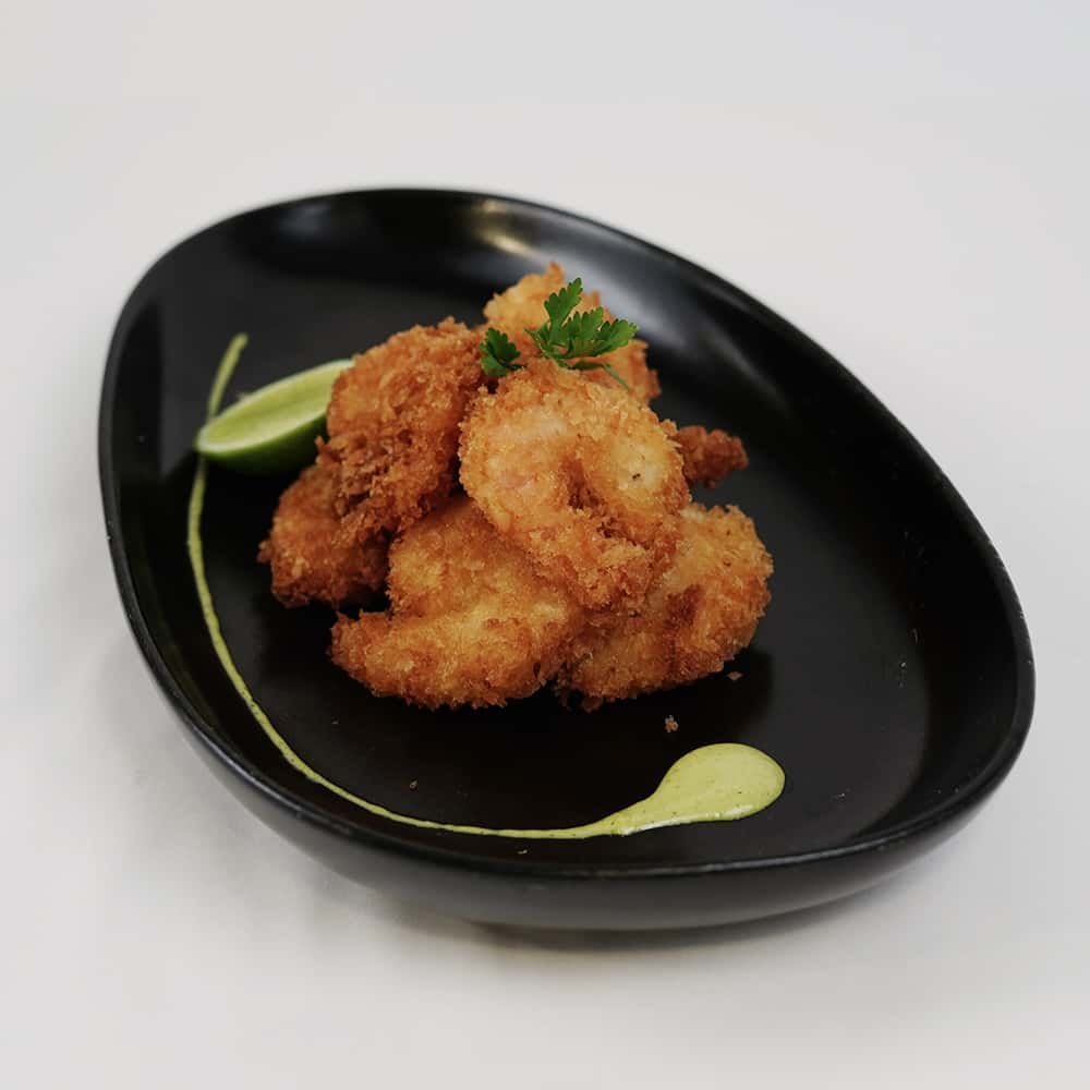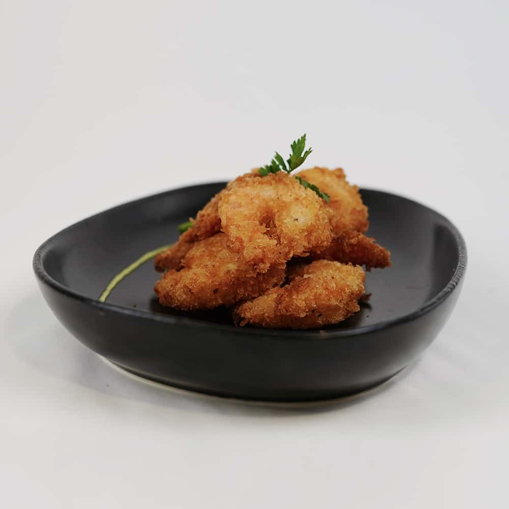 Presionar cada camarón Ecuadorian Roots (26/30) en la harina, dejar caer el exceso. Pasarlo a continuación por el batido de huevo y luego cubrirlo en migas de pan. Colocar los camarones preparados en una bandeja, sin que se toquen.
