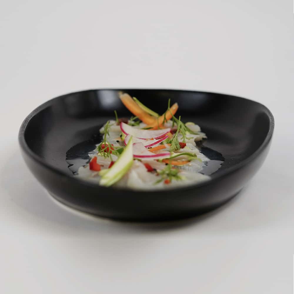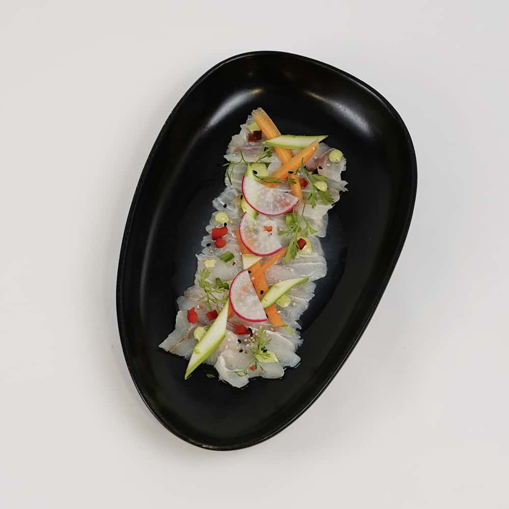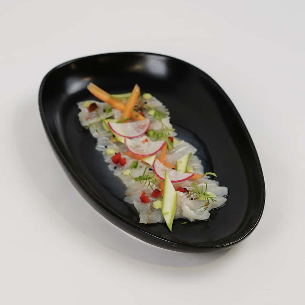 Limpia y corta los filetes de Dorado Ecuadorian Roots en láminas muy delgadas, sazonas con sal. Colócalas en un plato sobreponiéndose ligeramente unas con otras.